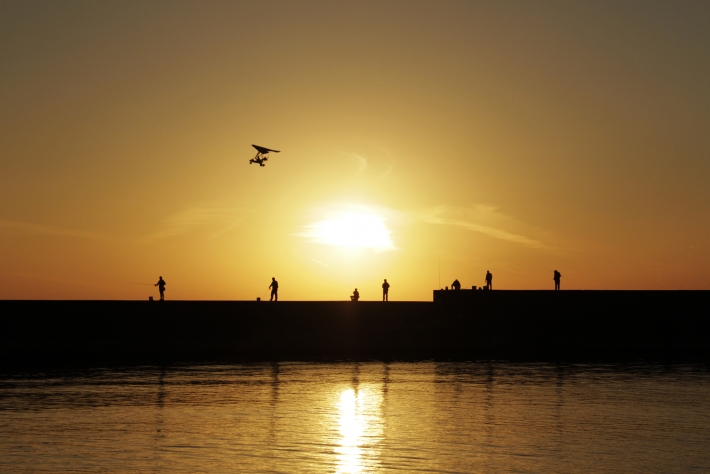 釣り人の頭上をモーターハンググライダー飛んで行きました。