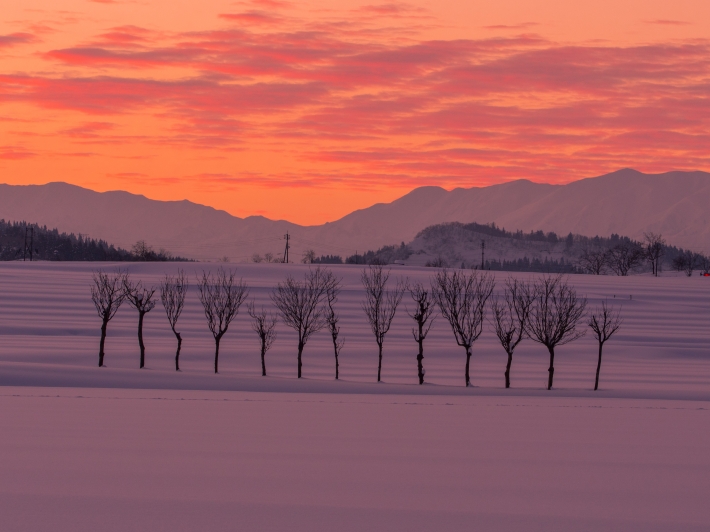 この日は朝焼けになり、はさ木の雪原が紅く染まりました。