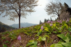 2.28 TAKAさん北五百田川の棚田のカタクリの花です。粟ヶ岳もみえます。(三条市)
