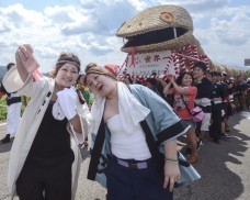 2.25 たぬちゃんさん関川の たいしたもんじゃ祭り での一コマ。2人の女性が 担...(関川村)