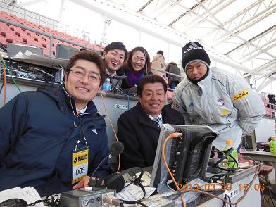 解説の有田一矢さん(前列中央)、ゲスト解説の寺川能人さん(前列右)、ピッチリポートの小尾浩子パーソナリティ(後列右)、サポートの高橋知幸アナ(後列左)、そして私(前列左)。