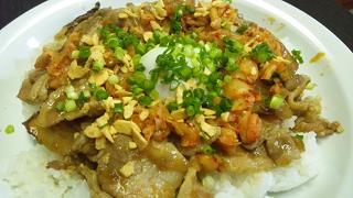 ごはんの上に炒めた豚肉とキムチ、温たま、ガーリックチップがのったもの。