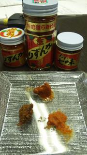 (下のお皿は、左「ぬれ七味」中央「6年仕込み」右「かんずり」)