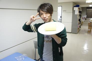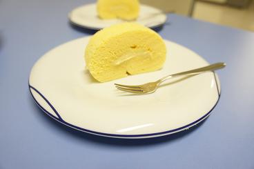 - 焼きあがった生地にクリームを塗り巻き上げる