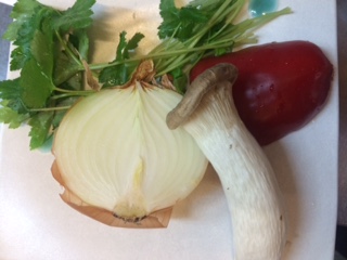 ① 玉ねぎ、エリンギ、赤ピーマンをみじん切りし、三つ葉は1cm弱に切る。