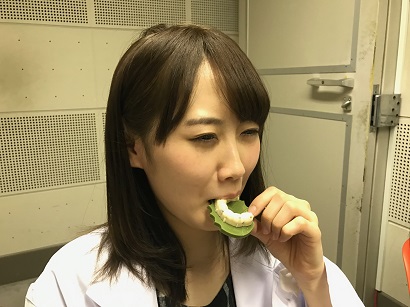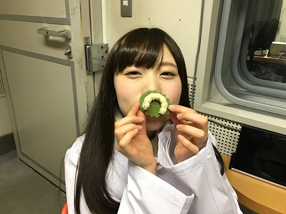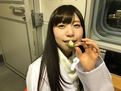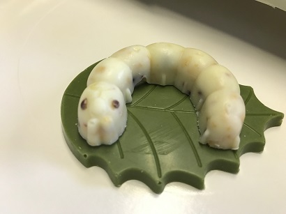 食べる。ちなみに、緑の葉っぱ部分は抹茶味。カイコ部分はホワイトチョコレートで、とってもおいしいんだよ。