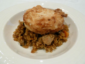 食べる直前にフライエッグを作る。 油を3cm程度はり中温にし、その中に玉子を割り入れ1分半程揚げ、半熟に仕上げる。 |