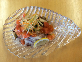 | ④ | キムチジュレはホイッパーで崩し、角切りトマトと合わせサラダにかける。 |