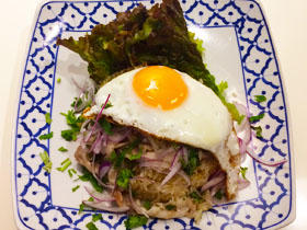 | ③ | 炊きあがったら、お皿に盛りつけ、トッピングのパクチーと生玉ねぎ、フライドガーリック、お好みで目玉焼きを乗せて、サニーレタスを添えて完成 |