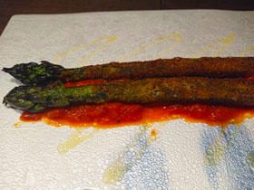 | ② | アスパラガスの下処理(はかまを取る、硬い部分をカットする等)をしたら、とき卵、小麦粉、①のカレーパン粉をつける。 |