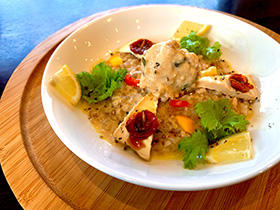 | ④ | お皿に盛り付け、「クリームチーズ醤油漬け」のスライスを添えて完成。 |