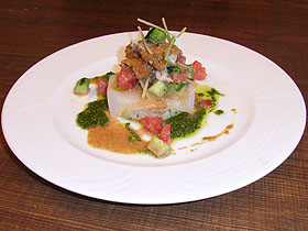 Eの2種類のソースは皿に描くようにのせて出来上がり