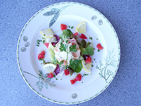 サークルをはずし、周りをレモン、トマト、イタリアンパセリなどで飾る。