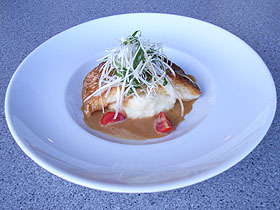皿に温めた@をのせ、その上に魚を盛りDのソースをかける。