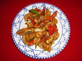 ロールイカとムキエビをボールに入れ、塩、うま味調味料で下味をつけ卵を入れて混ぜる。その後で片栗粉を入れて薄く衣をつける