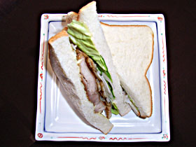 パンに辛子マヨネーズを塗り、鶏肉、ごぼう、筍、玉葱、春キャベツを挟み、重しを載せてしばらく馴染むようにしてから頂く。