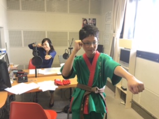 スタジオにも緑のかっこいい胴着を着てきてくれました。
