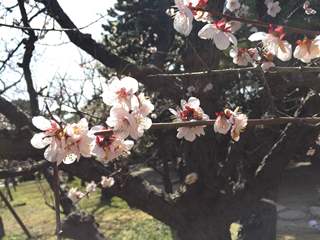 桃色や紅色の梅の花がきれいに咲いていて、公園は甘い梅の花の香りに包まれていました。
