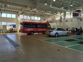 サービス棟は、待合室から整備中の車を