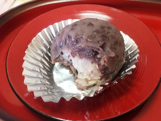 あんこをもち米でつつみ、桜の葉で包まれてた“桜おはぎ”