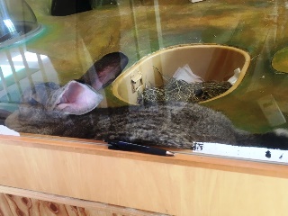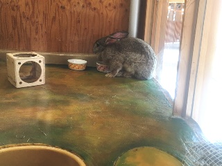 4畳ほどあるお部屋に、伸びると体長60cmほどもありそうな巨大うさぎが!
