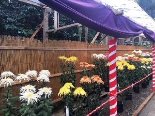 大きさや品種様々な菊が弥彦神社の境内から参道にずらりと並びます。