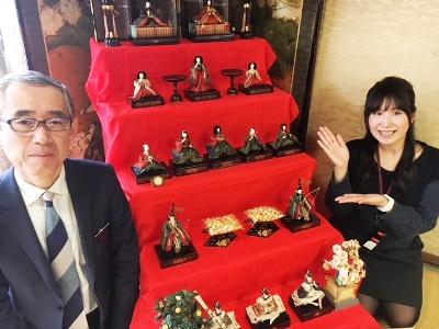 同時開催の「ひな巡り」は、全客室に雛飾りが展示されています。