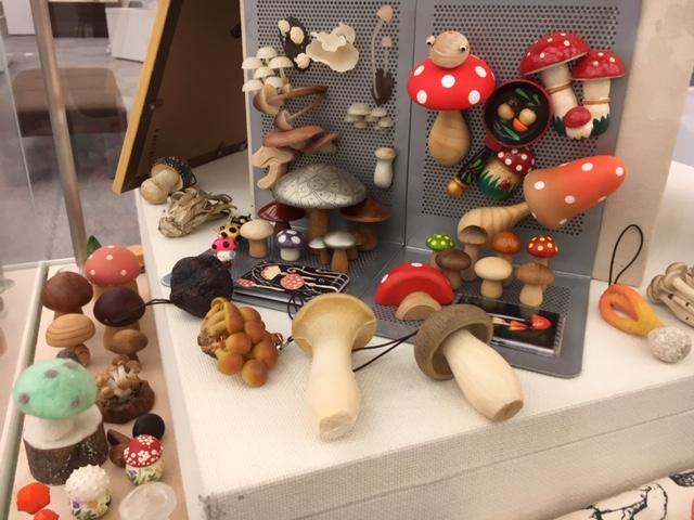 置物、キーホルダー、文房具、箸置きなど300以上の様々なキノコグッツが並びます。