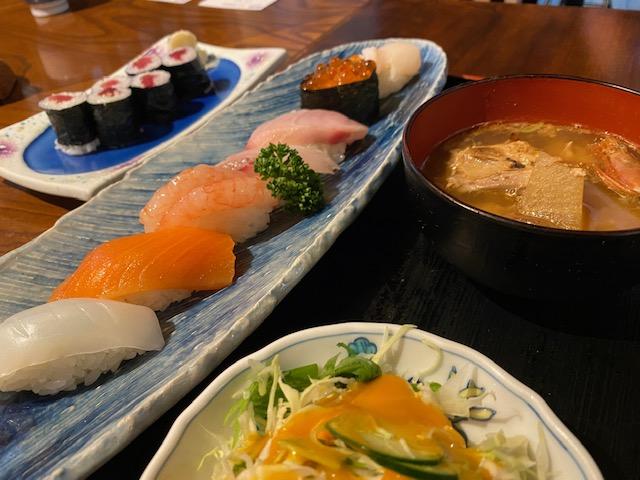 新鮮なネタのお寿司と巻物、あら汁、サラダが付いています。