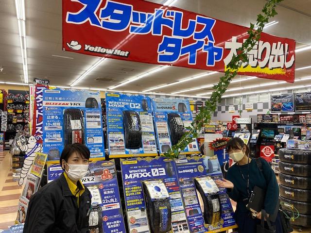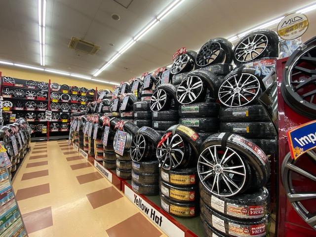 店内にはカー用品をはじめ、スタッドレスタイヤずらりと積まれています。