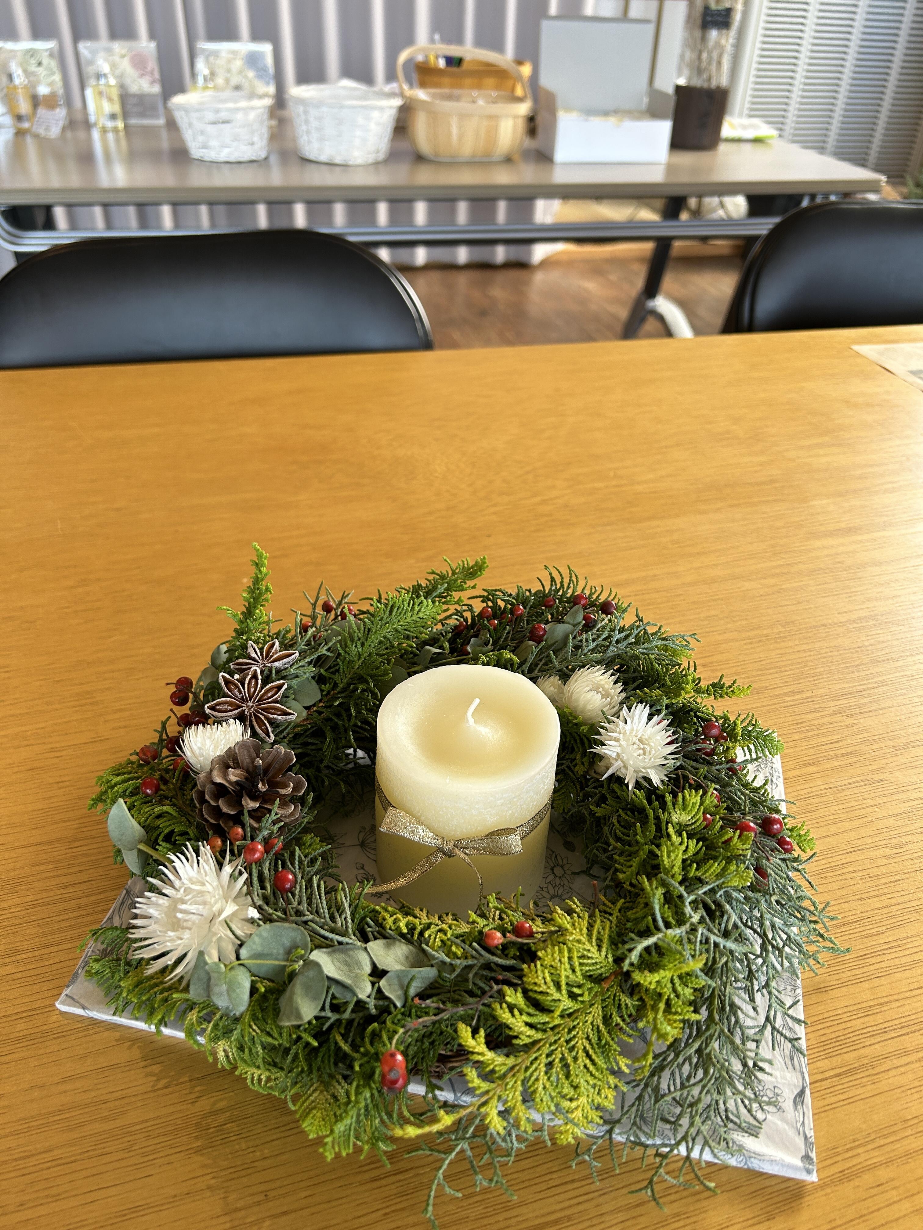 ヒバの枝葉でパピヨン型をつくり、コットンドライフラワーを装飾