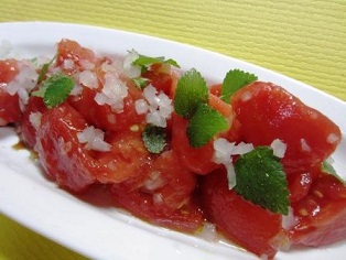 4)トマトと玉ネギを器に盛り、Aをかけて冷やす。