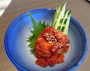 佐渡産のとれとれメジマグロと南蛮海老を和えたチャンジャ!