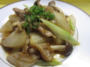 豚肉の色が変ったら長葱としめじを加えて更に炒める。