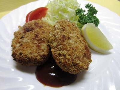 3)2)を小判型に丸め、小麦粉、溶き卵(1/2個分)、