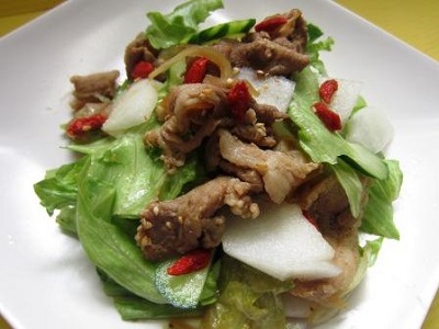 1)レタス、胡瓜、梨をサックリと混ぜて大皿に盛る。