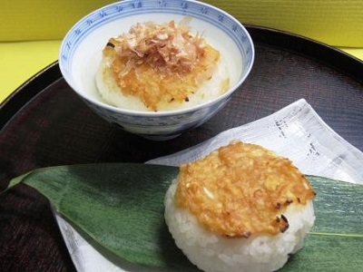 2)手のひらに醤油を薄くつけて固めにおにぎりをにぎり、両面をサッと焼く。