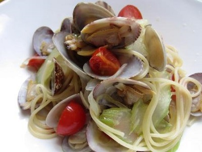 ①貝の殻が開いたら、茹で上がったパスタを加えて混ぜる。