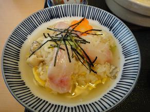 鯛の漬けをのせて、特製の熱々お出汁をかけます。
