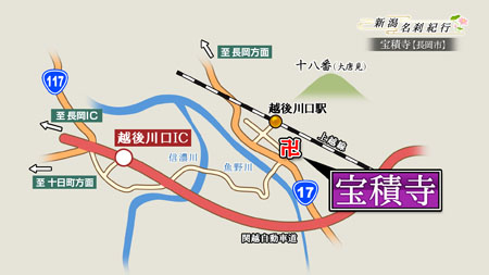 本尊は大日如来。先代の住職が西国三十三所を巡礼し、それに倣い開いた越後川口霊場が近くにある。三十三体の観音像が安置されていて、西国三十三所巡礼と同じご利益にあずかれるという。同寺の境内には第三十三番、十一面観世音菩薩が祀られている。