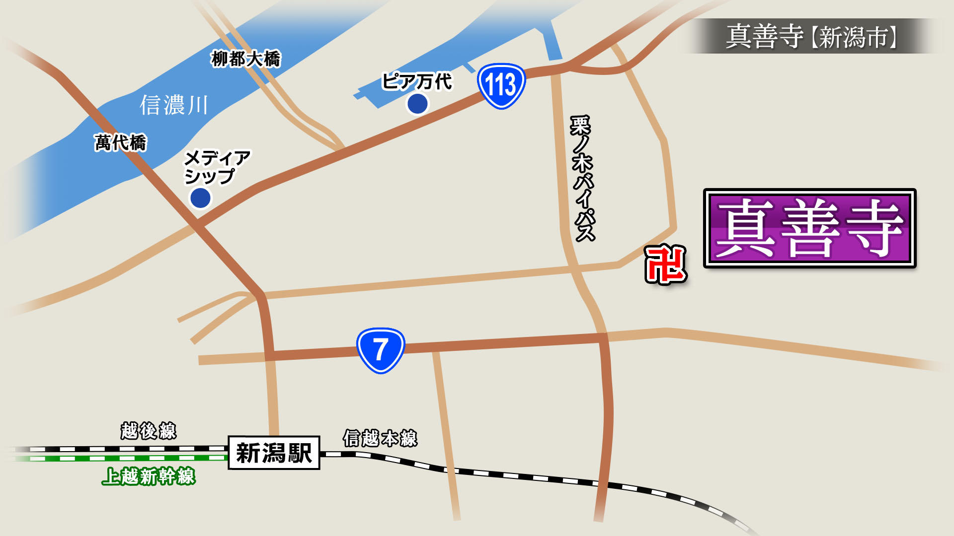 沼垂の町と共に4度の移転を繰り返し現在の地へ。本堂の天井には花鳥風月が描かれている。山門を入った右手にある「足ツボ増益寿命ロード」は心と体の健康を願い設置されている。