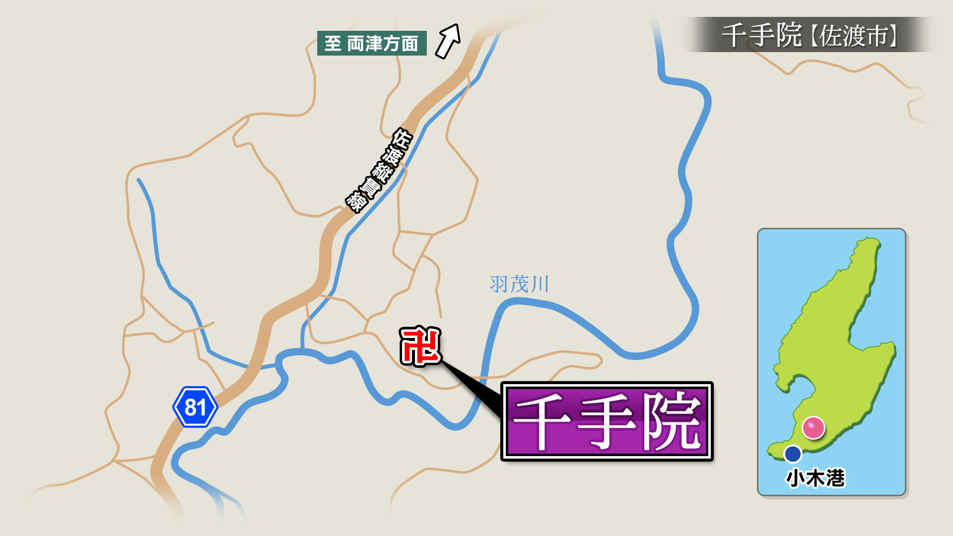 開創は1189年。佐渡本間氏の守り本尊を犬に飲ませて逃がしたが、滝に落下。