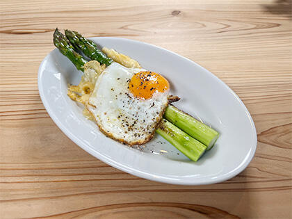 - フライパンにオリーブ油をしいてアスパラガスを中火で2分程度焼く。