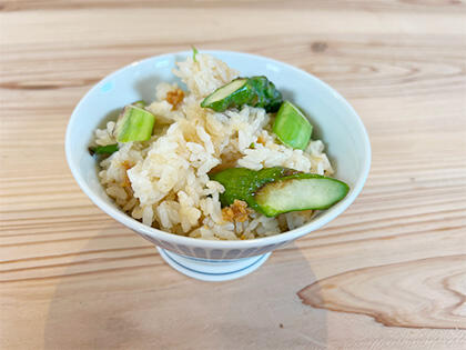 - 炊き上がったアスパラごはんから皮を取り出す。