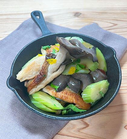 - フライパンにオリーブ油を入れてにんにくを炒め香りが出たら鶏肉を加 えて炒める。そこへ大凧しめじ、玉ねぎを加えて炒める。塩胡椒をする。 (分量外)