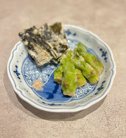- Aを混ぜ合わせて衣にし、タラの芽、海苔をそれぞれくぐらせて、180℃の油で揚げる。