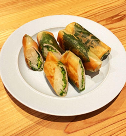 - 春巻きの皮を広げて、ハム、水菜、なしを入れて巻く。