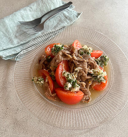 - フライパンにオリーブ油を入れ、にいがた和牛を焼く。ある程度火が入ったら、トマトを加えて器にもる。