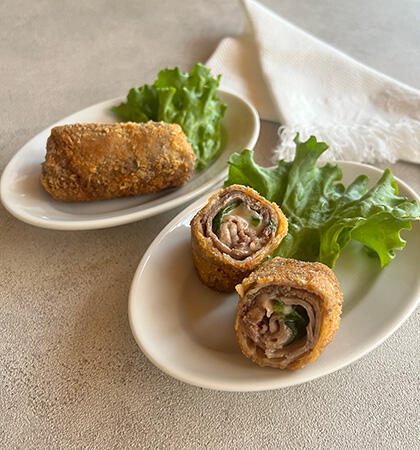 - 小麦粉、溶き卵、パン粉の順に衣をつけ、170℃の油で揚げる。