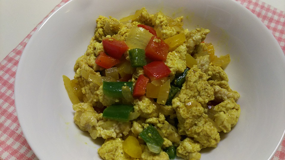 水切りした豆腐、鶏ひき肉、玉ねぎを中~強火で炒め、